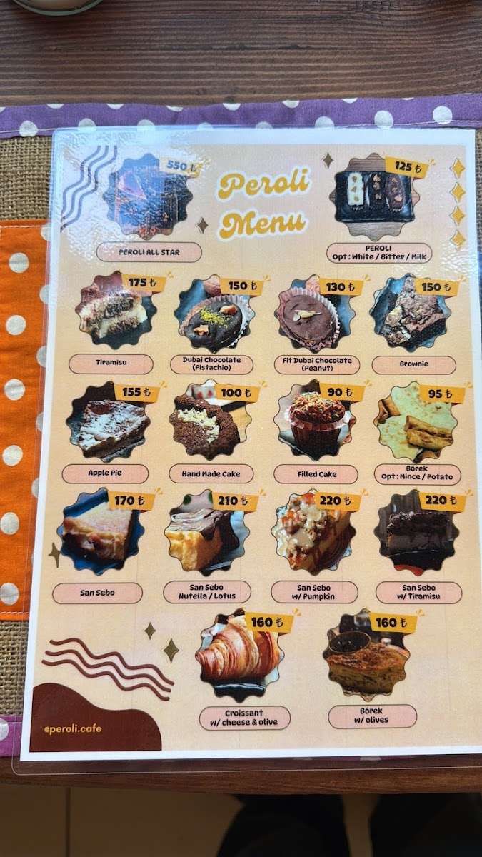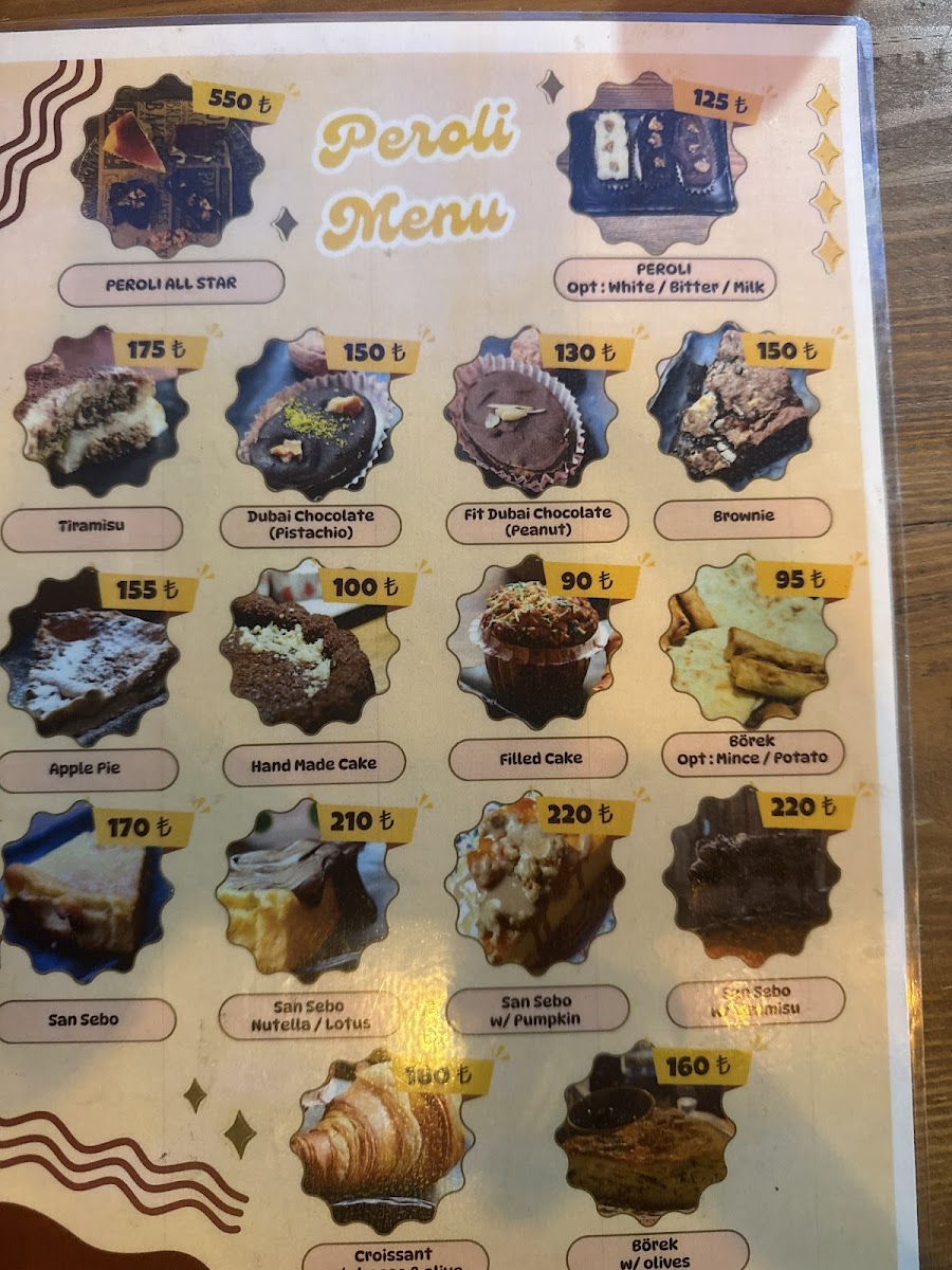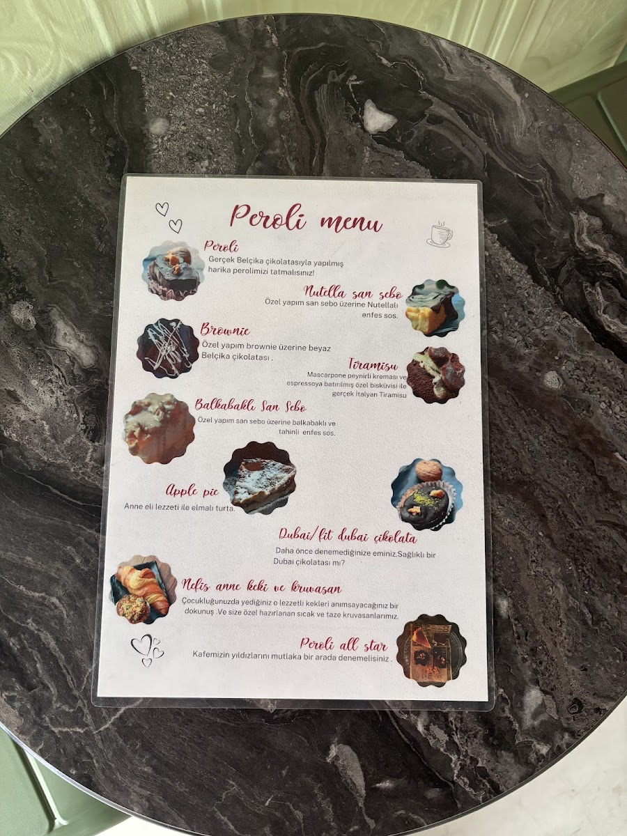 Peroli Cafe offers a diverse and satisfying menu, perfect for various tastes and preferences. For coffee lovers, their Americano, Latte, Cappuccino, Mocha, and Filtre Kahve are sure to please, while those looking for something sweet can indulge in their Nutella Bask Cheesecake, İnci Kuliç, BadeLotus Ya, and the delectable Nutella Dolgulu Tatlı. Refreshing drinks like the Cool Lime (30 Cl.) and Taze Sıkma Limonata (30 Cl.) are ideal for a hot day. The cafe also caters to those who enjoy strong coffee at home with Filtre Kahve (250 Gr.) and Espresso (250 Gr.). For a chilly treat, their Cold Brew, Iced Mocha, Iced Americano, and Iced Latte provide a cool, caffeinated experience. If you're in the mood for something calming, the selection of herbal teas such as Kış Çayı (48 Cl.), Ihlamur Çayı, Papatya Çayı (48 Cl.), Hibiskus Çayı, and Yasemin Çayı offers a soothing choice. For those who prefer indulgent warm beverages, Sıcak Çikolata and Sahlep are comforting options. Don't miss out on their combo meals like the Peroli All Star and Muhteşem Üçlü Menü-perfect for a complete, flavorful experience.